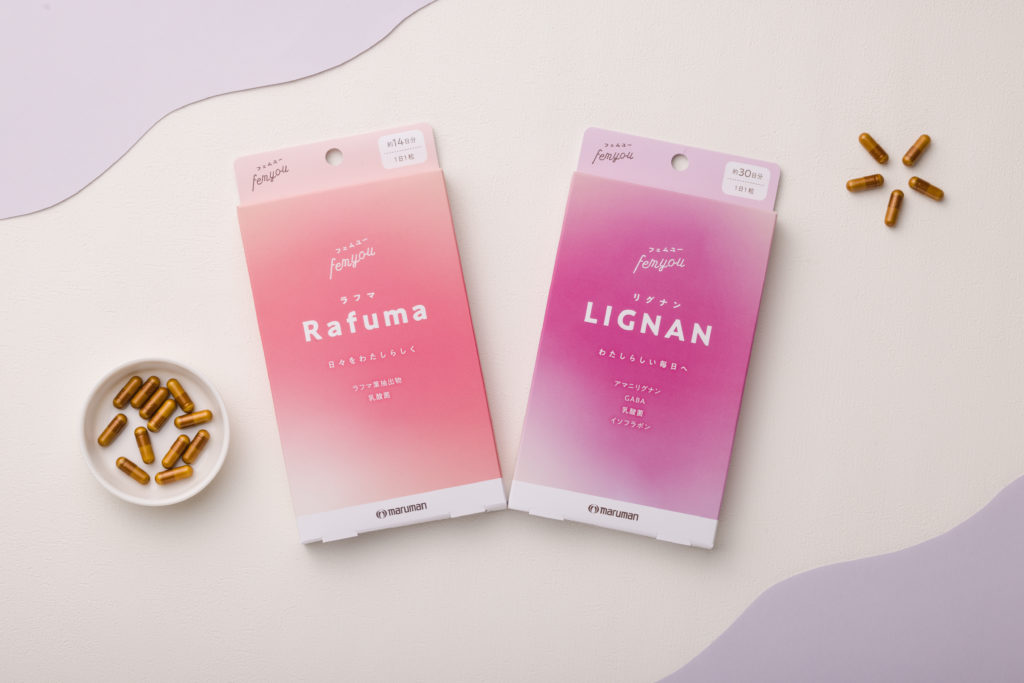 ライフステージによって変化する女性の体と心、そして⼥性特有のリズムに寄り添うフェムケアブランド「フェムユー」。月経やPMS、年齢を重ねて訪れる揺らぎに向き合う2種のサプリメントが揃います。PMS期の心身を⽀える「Rafuma(ラフマ)」は14日分、月経前の2週間に。年齢とともに起こる変化に寄り添う「LIGNAN(リグナン)」は30日分で毎日の習慣に取り入れやすいのが嬉しいポイント。「わたし